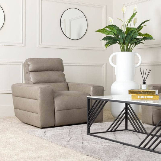 Experience ultimate comfort and style with the Salerno range in taupe. Crafted with timeless perfection, this sleek leather effortlessly complements any interior decor and features a convenient power recliner function for added comfort.