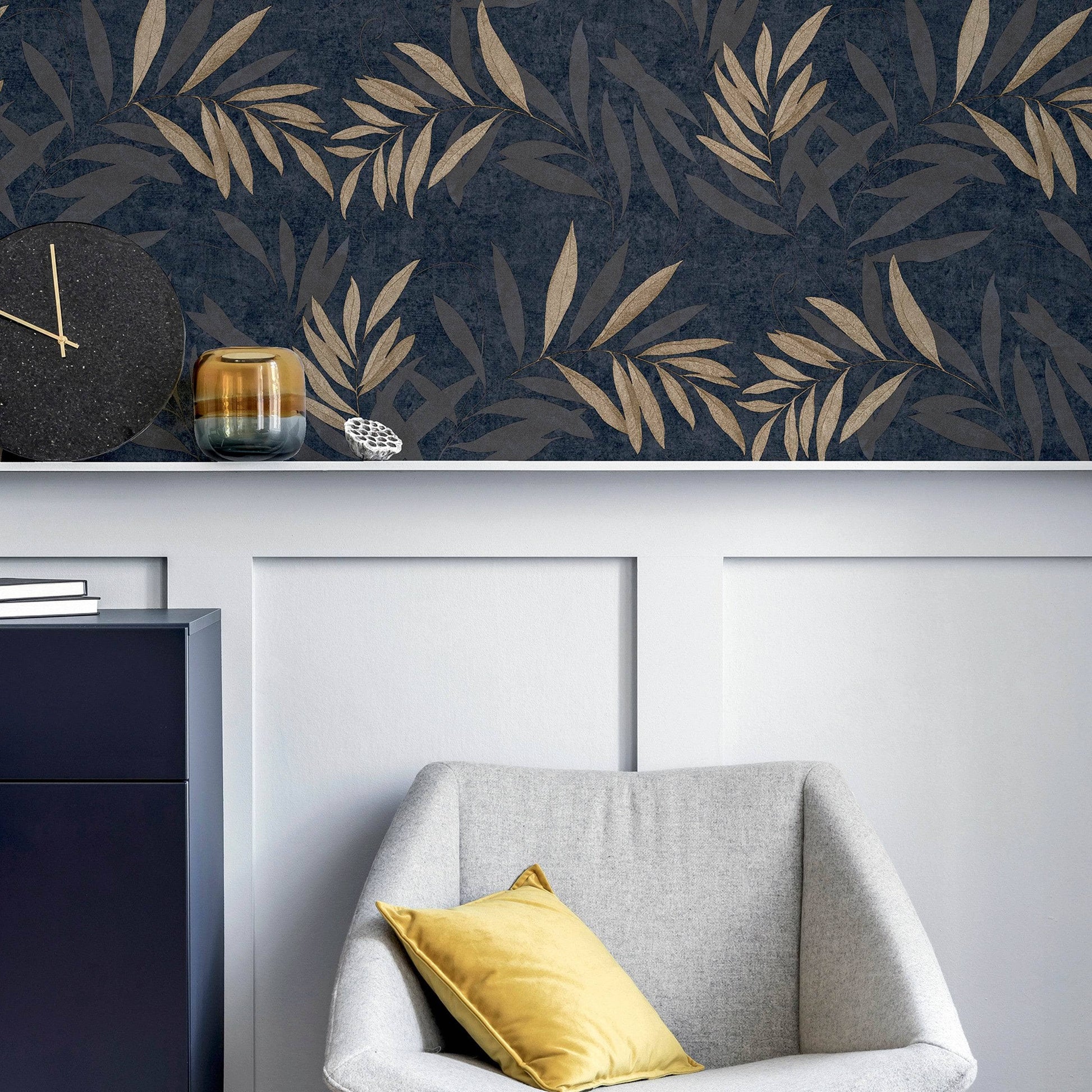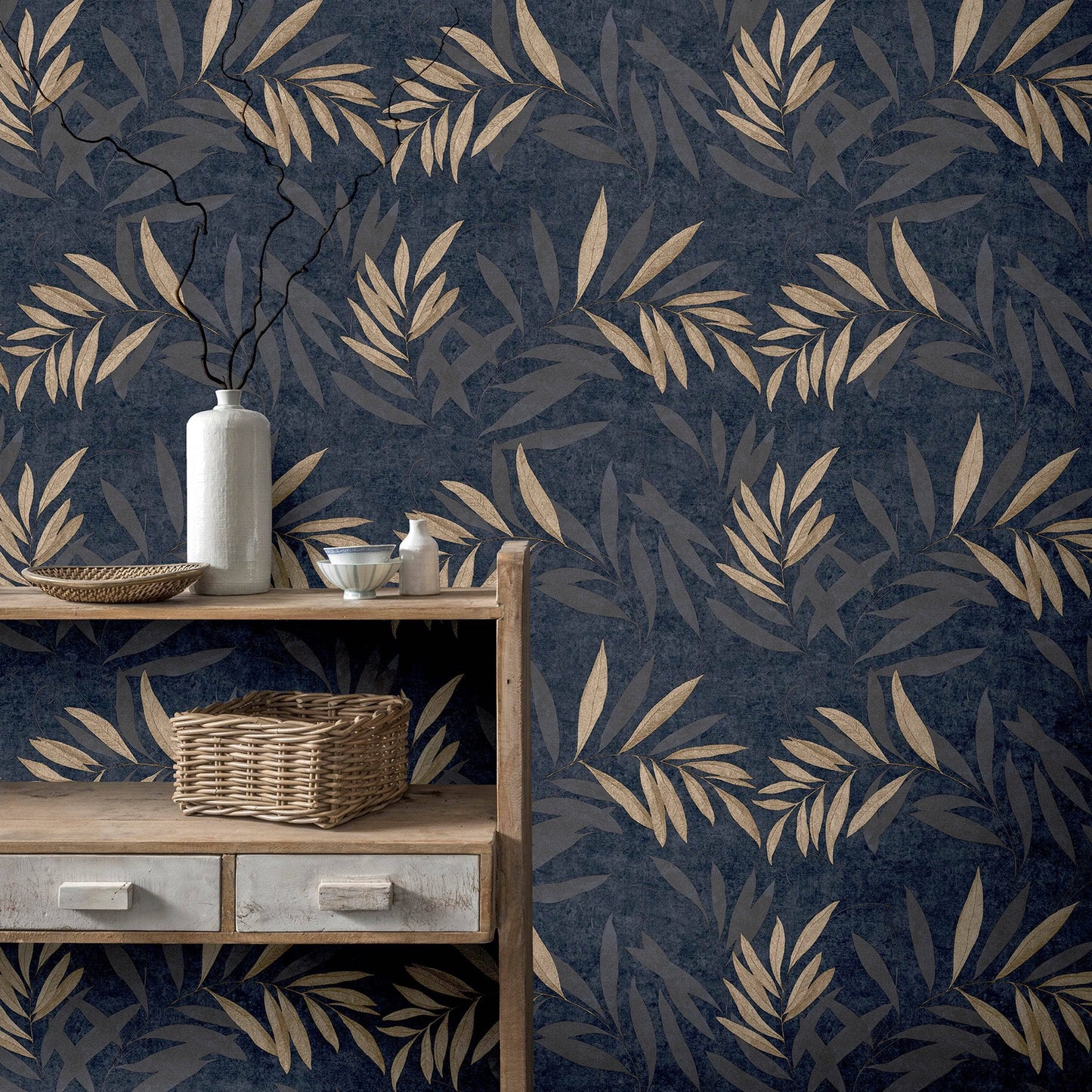 This luxurious wallpaper design features delicate champagne metallic leaves on a rich navy background. Elevate your home decor with this dramatic yet elegant addition, perfect for any living space. Add a pop of colour and instantly elevate your room with this stunning wallpaper.