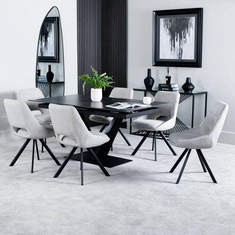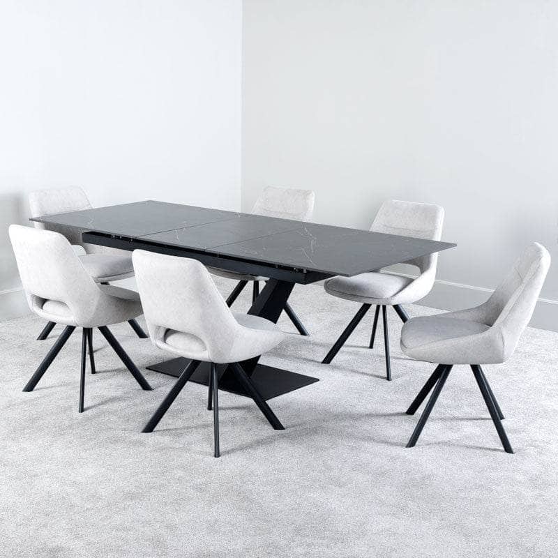 Crafted from sintered stone, this table not only exudes contemporary charm but also offers durability and ease of maintenance with its easy-to-clean surface. The light grey fabric chairs complement the chic design.