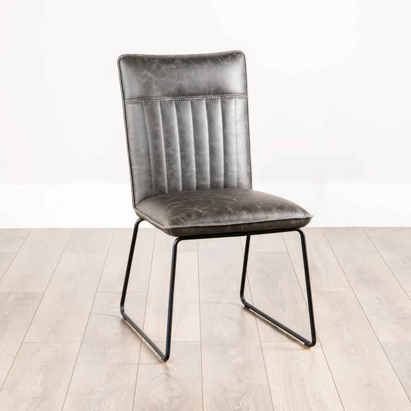 Our Hooper Grey Chair adds style to your living space. This is guaranteed to wow with its grey stitched leather and stainless steel legs throughout your modern home décor.