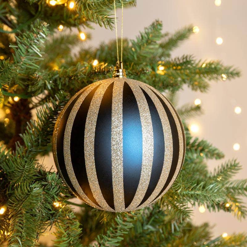 Experience the luxurious charm of the Dark Blue & Champagne Striped Christmas Bauble - 15cm. Its deep blue hue perfectly complements the sparkling champagne glitter, evoking a timeless and festive vibe. The elegant striped design adds a touch of glamour to your Christmas tree, making it the perfect addition to your holiday decor!