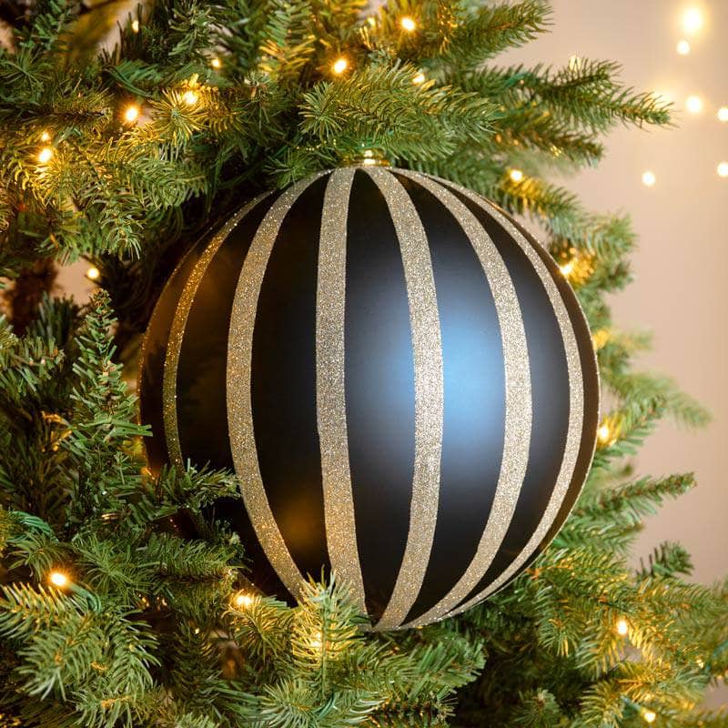 Experience the luxurious charm of the Blue & Champagne Striped Christmas Bauble - 25cm. Its deep blue hue perfectly complements the sparkling champagne glitter, evoking a timeless and festive vibe. The elegant striped design adds a touch of glamour to your Christmas tree, making it the perfect addition to your holiday decor!