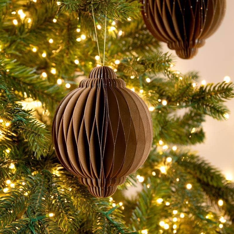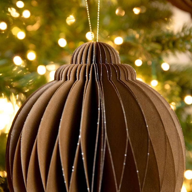 Elevate your Christmas decorations with this unique brown paper onion ornament. Its traditional bauble shape and on trend brown colour add a charming touch to any tree. Spread holiday cheer with this 15cm ornament.