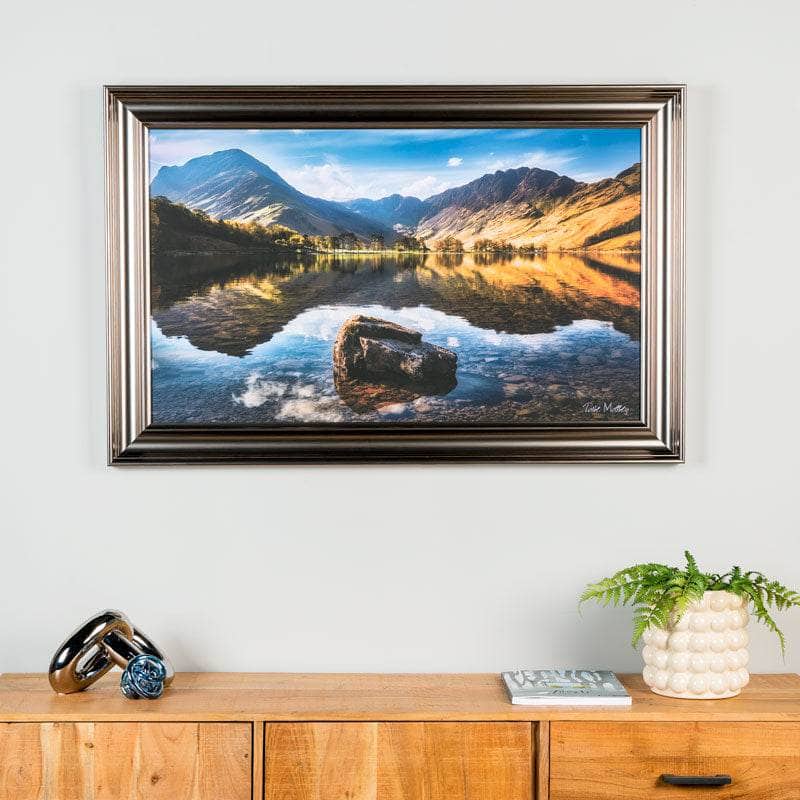 The Buttermere Framed Picture captures the beauty of Buttermere Lake in the Lake District with reflective clarity. Its tranquil landscape offers a sense of peacefulness that brings relaxation and serenity to any room. Set within a metallic frame, it is sure to enhance the look and feel of your interior space.