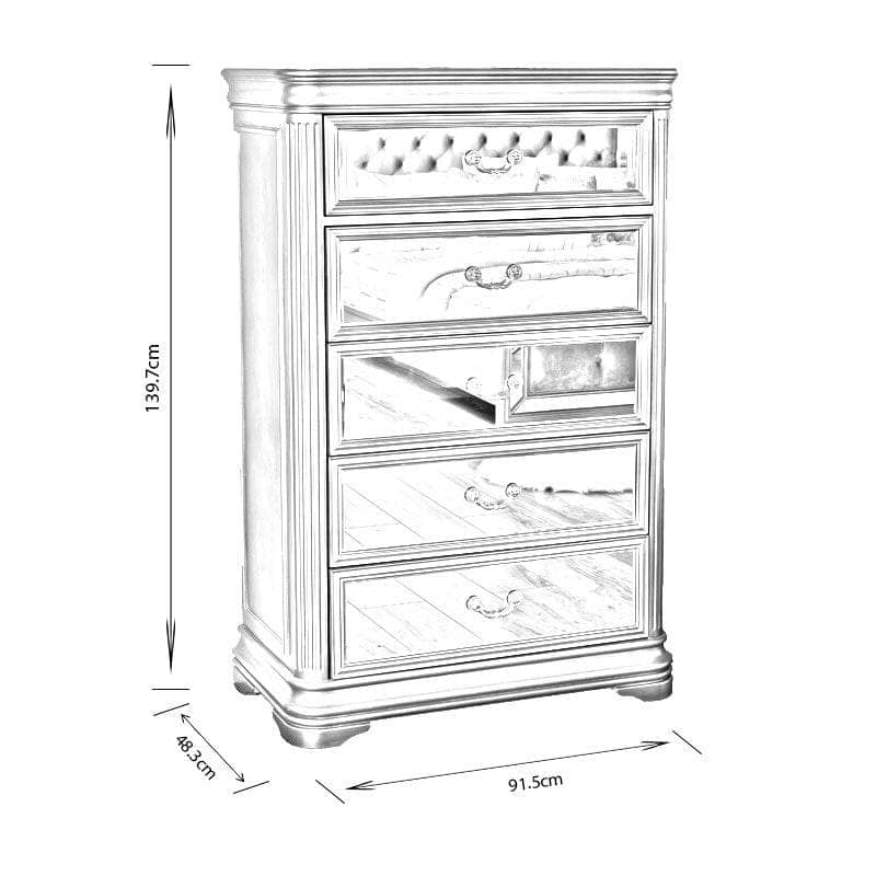 The Clio collection exudes style and luxury. Handcrafted from eucalyptus, this Clio Tall 5 Drawer Chest features mirrored facing panels, a uniquely designed drawer design and a smooth top finish providing elegance to your bedroom that will be sure to make you feel like royalty.