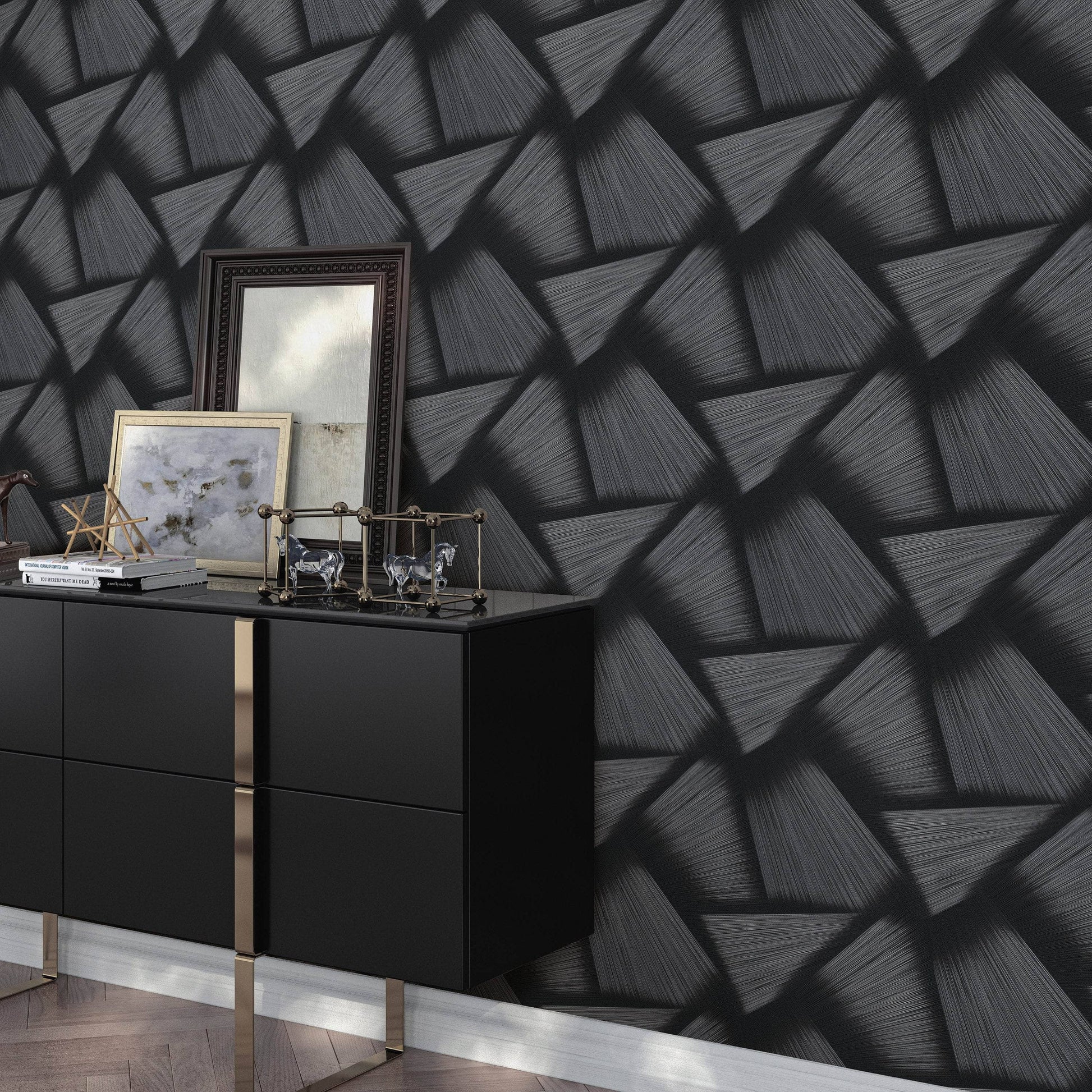 Elevate your bedroom or living area with the striking Erismann B46 Graphic Black Wallpaper. Its dark, sleek black tones and interlocking geometric shapes create a bold feature wall that commands attention. The textured, brushed-metallic finish adds depth and sophistication, transforming any space into a modern statement of style.