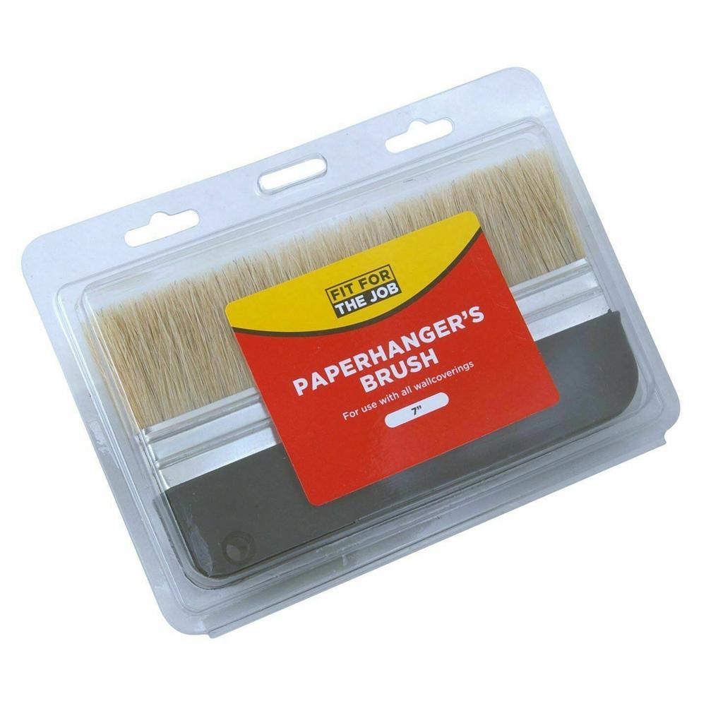 A budget paper-hanging brush mounted on a black textured plastic stock.