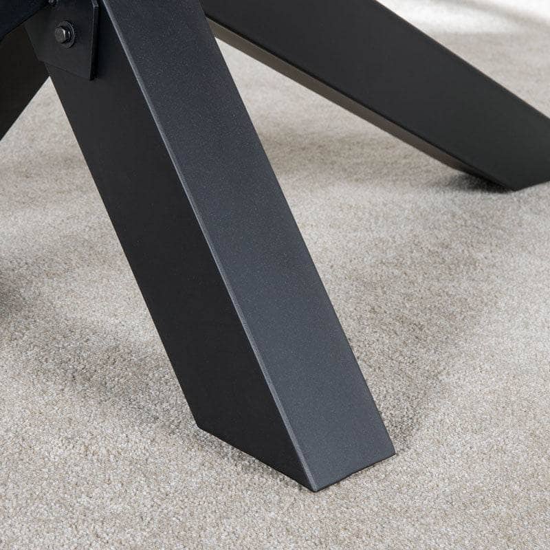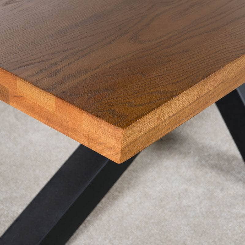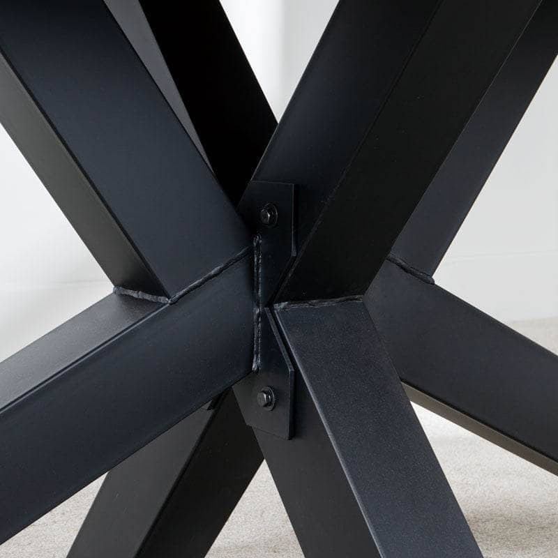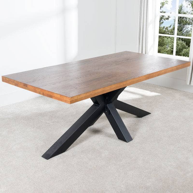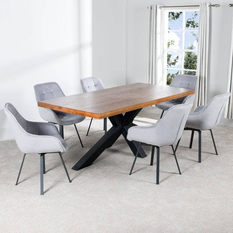 Crafted from sustainable oak, the table showcases exquisite wood grain and natural markings, highlighting its handcrafted quality. Its central star base, made from black powder-coated metal, adds an industrial edge, complementing the table's rustic charm. It's paired perfectly with six fabric chairs in a sleek silver finish, each featuring black legs for a cohesive look that blends industrial aesthetics with contemporary elegance.