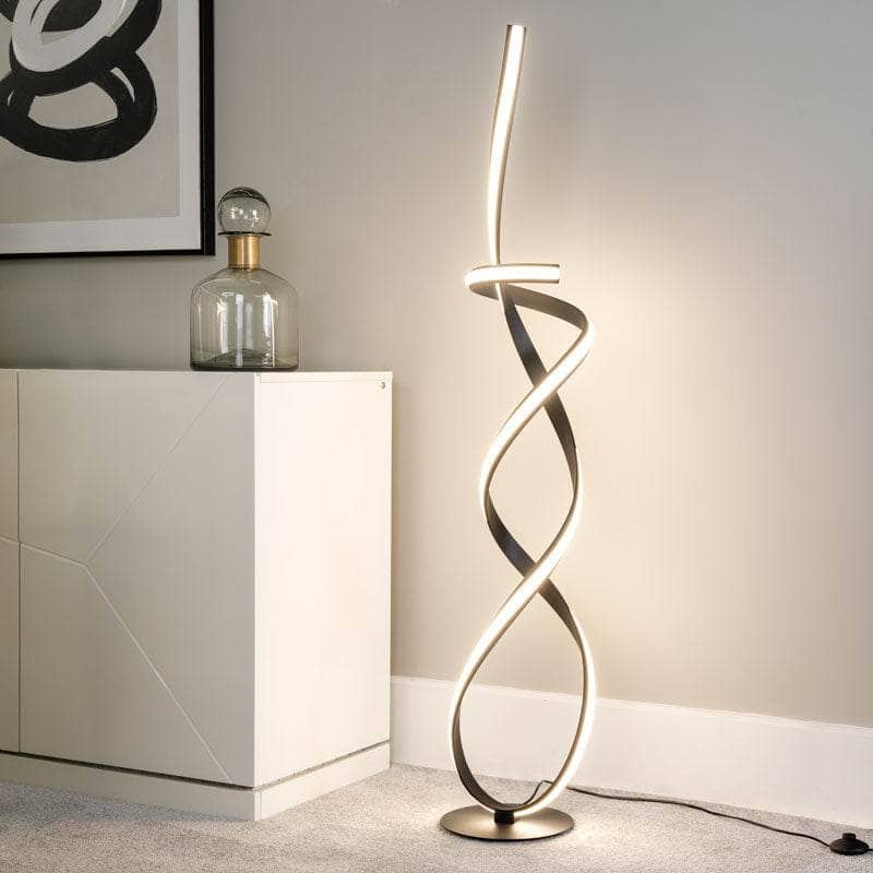 This modern Foggia LED floor lamp from Sand Black adds a unique touch to any room with its eye-catching shape. Adjust the lamp's height and angle with ease, and enjoy the convenience of a foot switch for effortless on and off.
