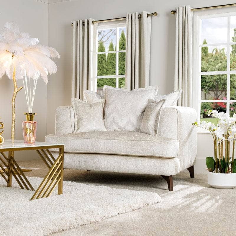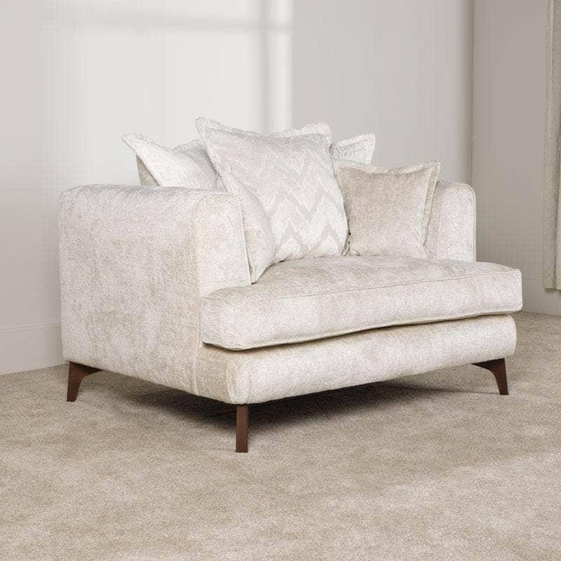 Elevate your living space with the Leon Snuggler - Oyster. This stylish piece boasts a modern design, featuring sophisticated oyster upholstery, sleek walnut legs, and an accent cushion. Sink into comfort with its feather-filled pillows, creating the perfect combination of luxury and style for any room.