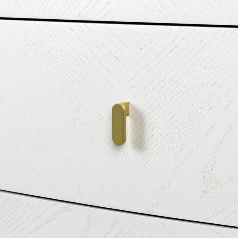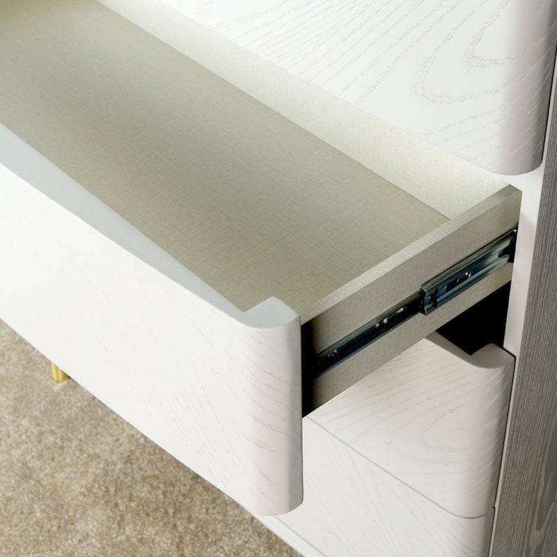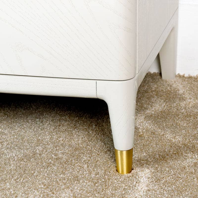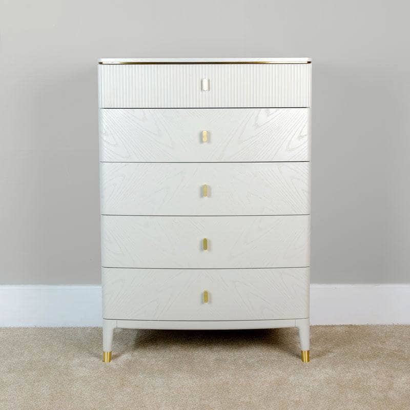 The Plaza Tall Chest is a modern and sophisticated chest of drawers that will bring a touch of luxury to any bedroom or living room. Its smooth white design is complemented with gold finishing touches for an eye-catching look, while five drawers provide ample storage space for all your belongings.