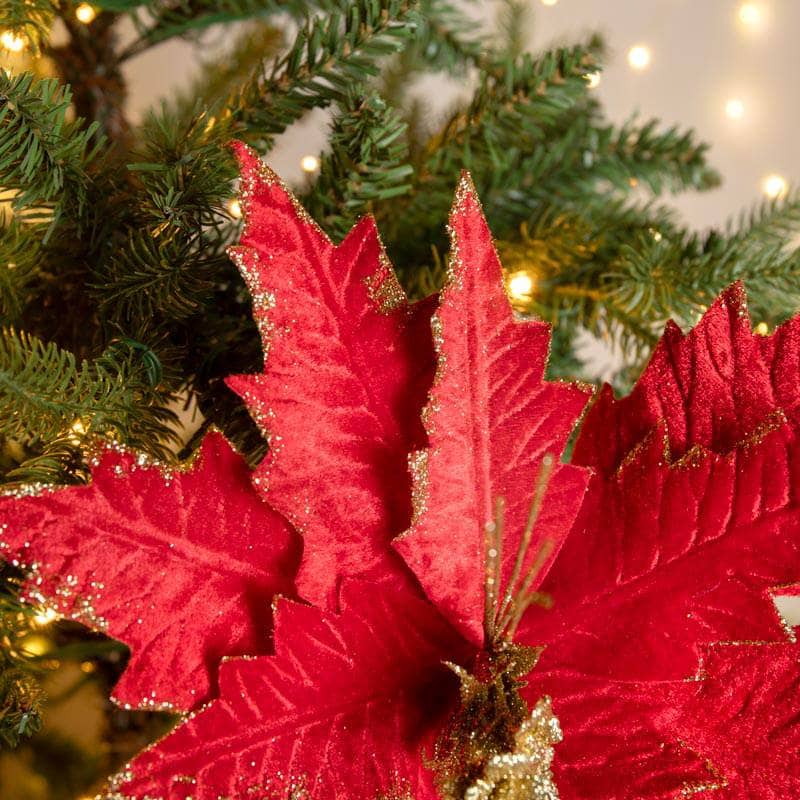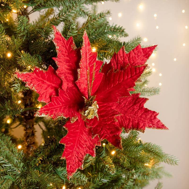 Add a touch of magic to your Christmas decorations with our Red & Gold Poinsettia Decoration! This elegant 33cm flower evokes warmth and tradition, elevating your holiday decor. Perfect for adding a festive touch to your tree, wreath, or garland. Spread holiday joy with this stunning decoration.