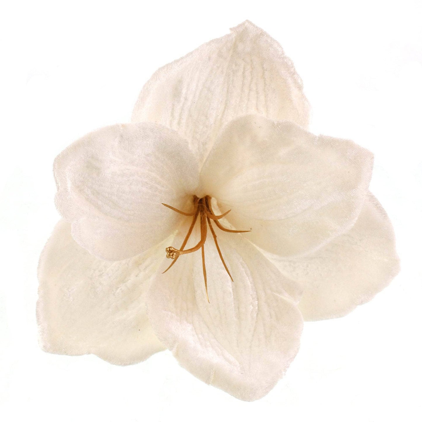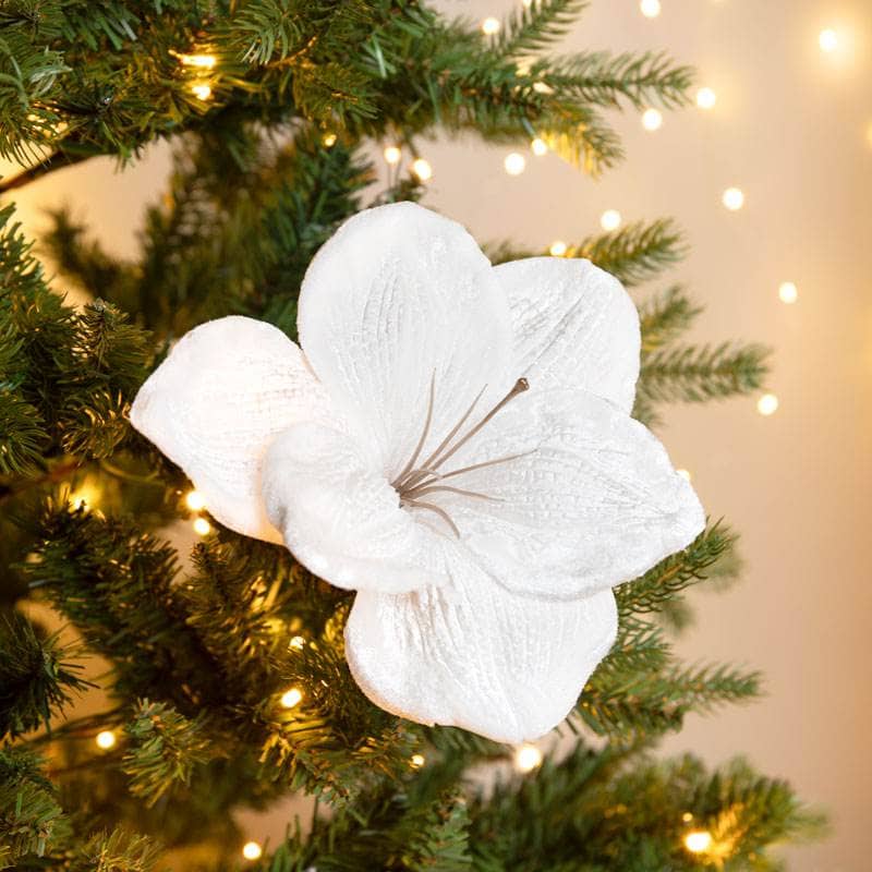 Transform your holiday decor with the luxurious White Velvet Amaryllis Clip Decoration! This 14cm piece embodies the timeless elegance of the Amaryllis flower and easily clips onto your Christmas tree. Elevate your home with this exquisite and charming addition.